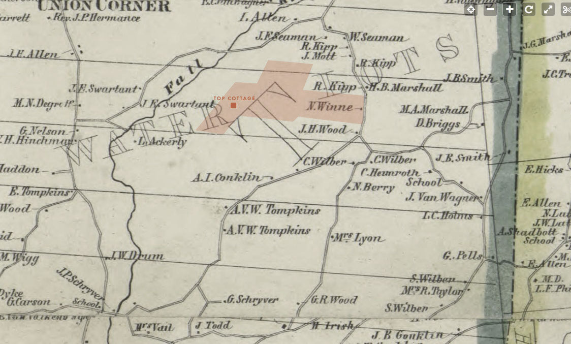 - The 1858 map of Dutchess County shows it to be directly west of Nicholas Winne’s farm property, approximately 2,400 feet away from the 1822 farmhouse on the eastern edge of the property within the same parcel boundary within the “Nine Water Lots” of the Great Partners Patent.
