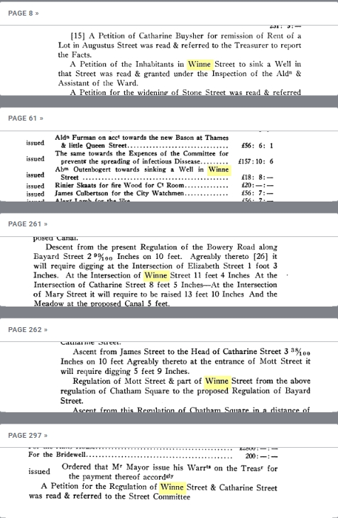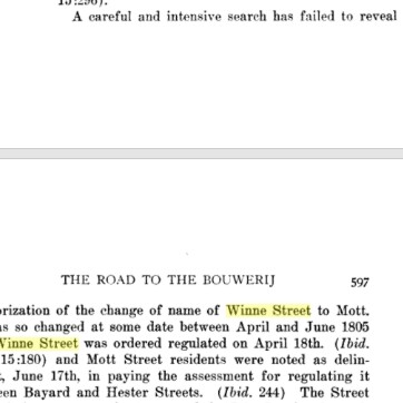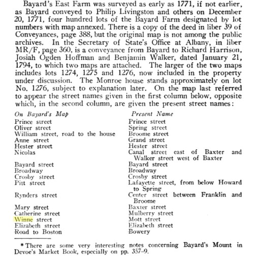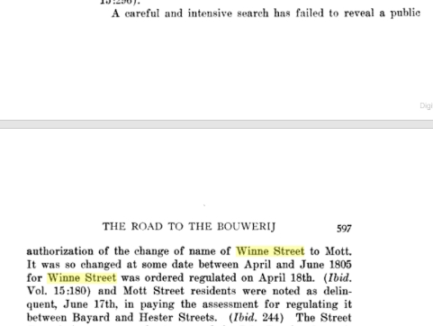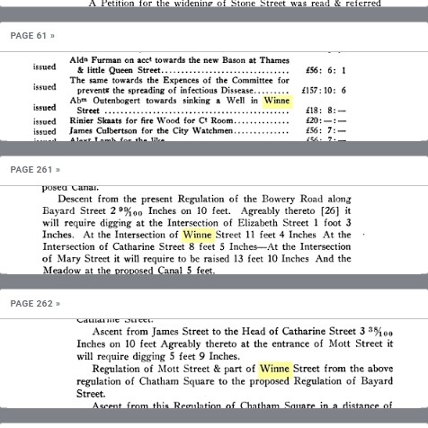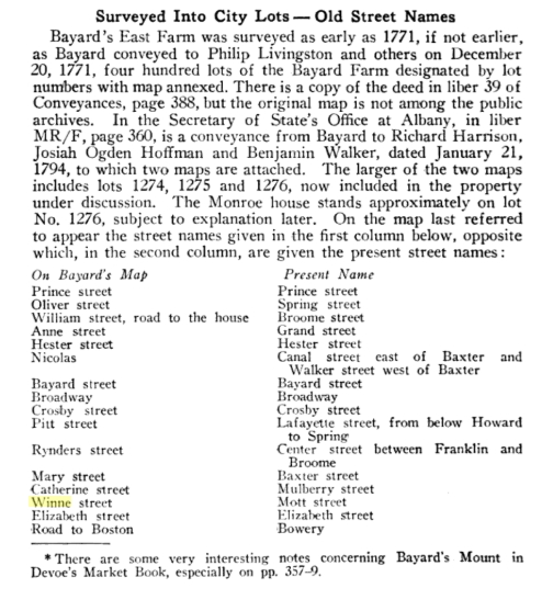Another mystery (in addition to the changing of the Winne surname) surrounding the family is the Winne Street in downtown New York City. The street was located where present day “Mott Street” exists and was part of Bayard’s East Farm. Initially the majority of the street was called Winne Street with only the China Town section that angles to the south, Mott Street. Records indicate the farm was surveyed in 1771 or maybe slightly earlier.